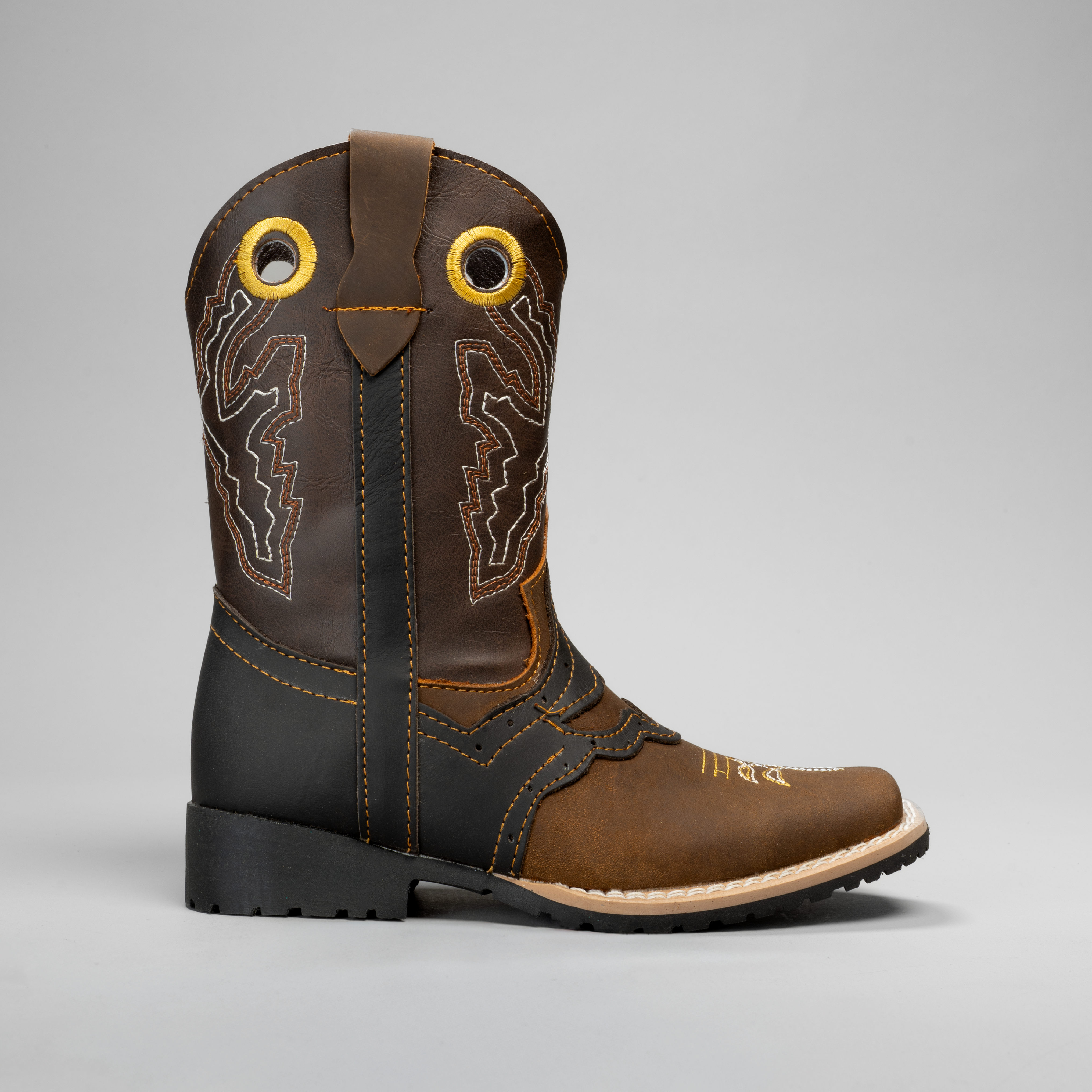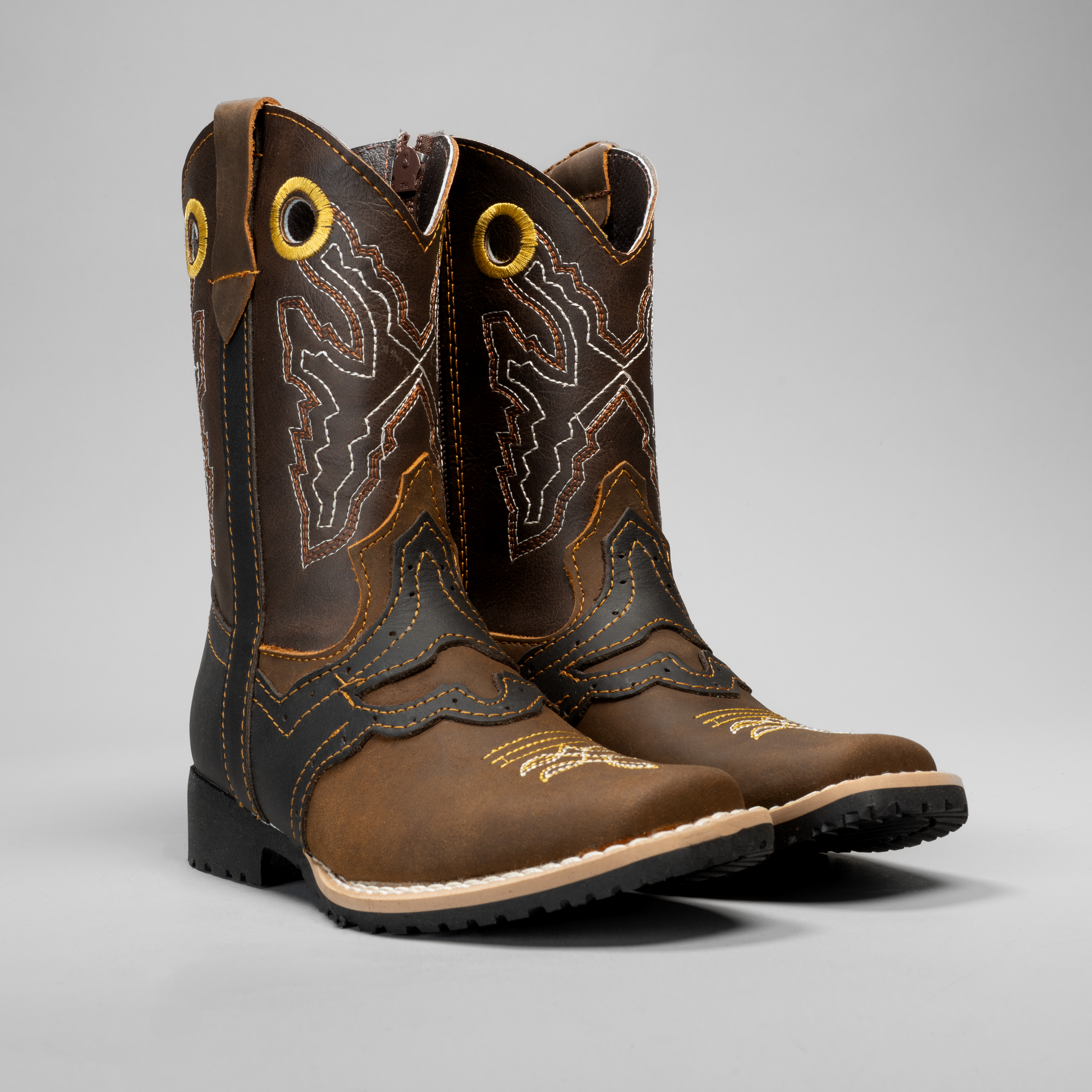 These kid's cowboy boots feature a classic square toe silhouette with intricate embroidered detailing that captures authentic Western style. Designed for young riders and enthusiasts, they combine traditional craftsmanship with durable construction to withstand active wear. The embroidered patterns add character while the structured toe provides reliable support for all-day comfort. Perfect for ranch work, rodeos, or Western-inspired fashion, these boots help kids embrace their cowboy spirit with confidence and style.