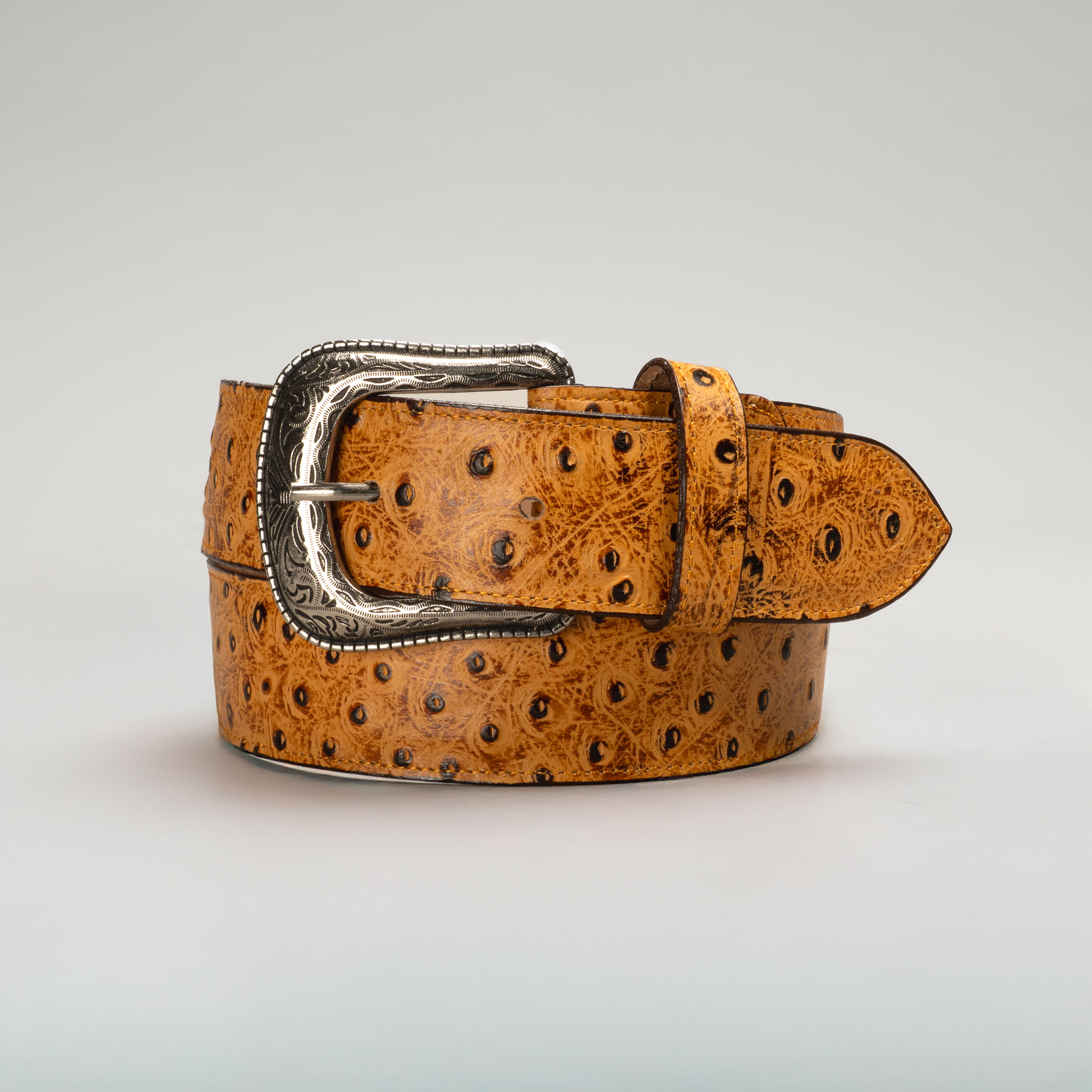 This Men's Ostrich Leather Cowboy Belt is expertly crafted from genuine ostrich leather, known for its distinctive texture and exceptional durability. Its precise construction ensures a comfortable fit and long-lasting wear, combining authentic western style with refined quality. Ideal for those seeking a sophisticated accessory that balances ruggedness with elegance.